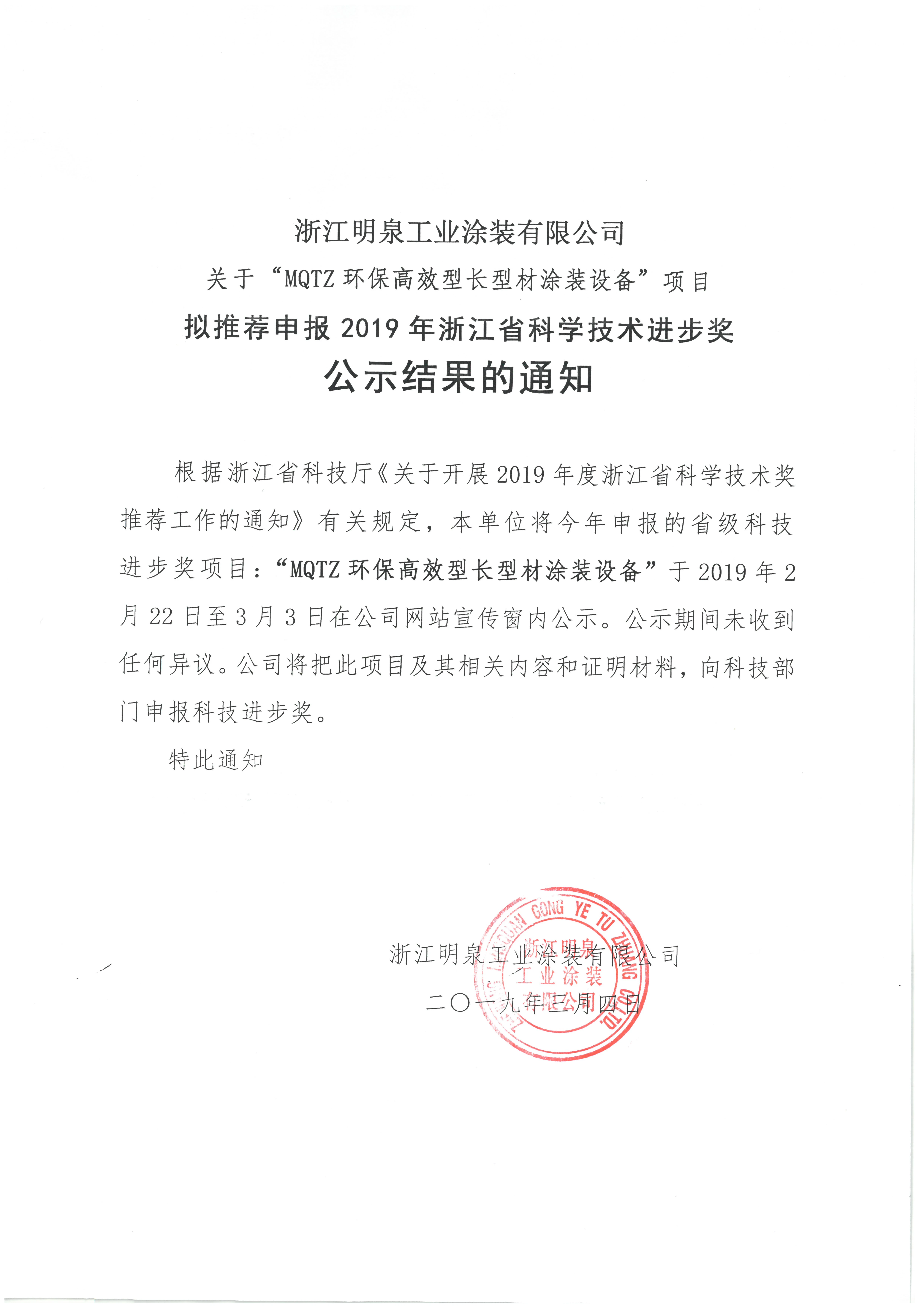 明泉公司申报2019年浙江省科学技术进步奖公示结果