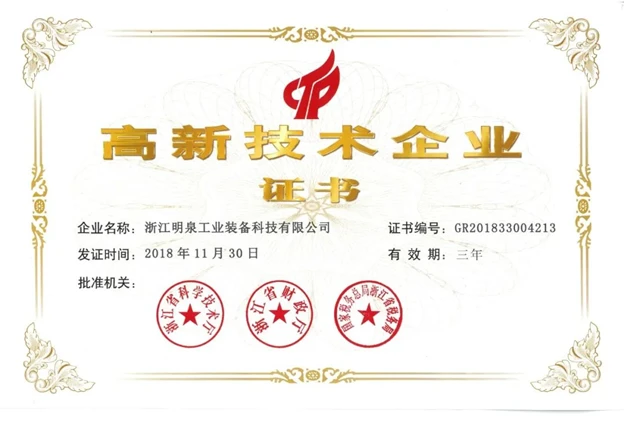 2020年明泉取得发明专利4项、主导及参与国家与行业标准9项,复评认定高新技术企业、荣获浙江省、市级高新技术企业研究开发中心、浙江省信用管理示范企业、浙江省企业标准“领跑者”、浙江省首台(套)装备工程攻关项目等多项证书。我们取得的成绩很多:科技创新能力大幅提升,创收研发比翼齐飞,培养新一代明泉中流砥柱,加大拓展海外市场。