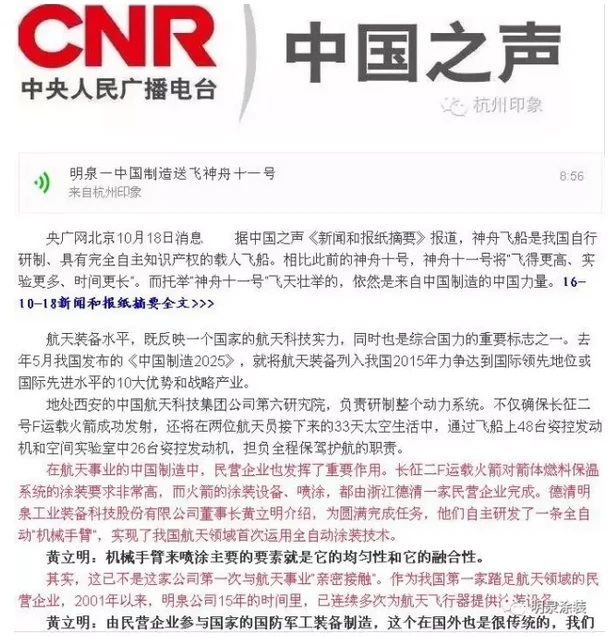 这一年,明泉影响力,就是上了国家级媒体新华社、中央台、省市级电视、报纸、广播、新媒体,它们都争相报道了《发射神舟十一号火箭含“德清元素”》、《“湖州制造”助力“神舟十一号”成功腾飞》、《十五年倾情航天心不改 德清一民企助力“天宫二号”飞天”》的新闻,这家民企不是别人,正是浙江明泉工业装备科技股份有限公司。