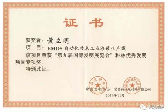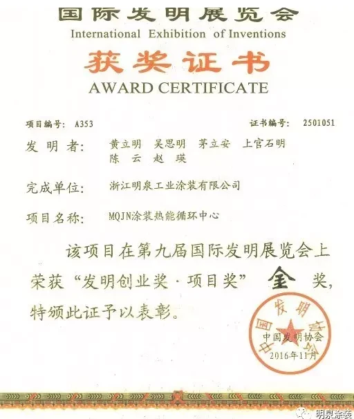这一年,明泉新创造,十项由中华人民共和国知识产局颁发的发明专利证书的创新发明成果,长型材涂装设备、静电喷涂涂装设备、立式型材静电喷涂涂装设备、条状型材立式涂装设备、涂装设备专用阀门、脱脂清洗机构、一种倒砂装置的倒料机构、一种倒砂装置的支架发明专利、一种倒砂装置发明专利、用于涂装设备的气固混合器……都是专业术语,如果您不觉得烦,还可以继续给您如数家珍,娓娓道来。明泉喜获2016年度“浙江制造精品”称号,黄立明董事长也荣登2016年第五届湖州市优秀发明人榜单。