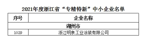 浙江明泉工业涂装有限公司被认定为2021年度浙江省“专精特新”中小企业