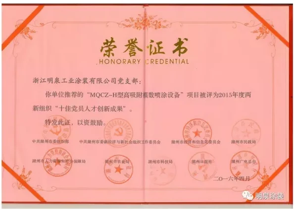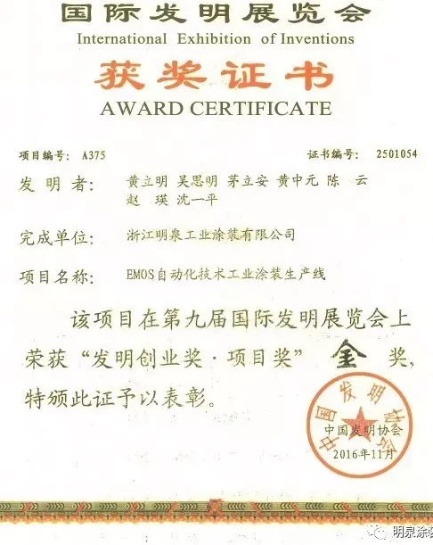 这一年,明泉新创造,十项由中华人民共和国知识产局颁发的发明专利证书的创新发明成果,长型材涂装设备、静电喷涂涂装设备、立式型材静电喷涂涂装设备、条状型材立式涂装设备、涂装设备专用阀门、脱脂清洗机构、一种倒砂装置的倒料机构、一种倒砂装置的支架发明专利、一种倒砂装置发明专利、用于涂装设备的气固混合器……都是专业术语,如果您不觉得烦,还可以继续给您如数家珍,娓娓道来。明泉喜获2016年度“浙江制造精品”称号,黄立明董事长也荣登2016年第五届湖州市优秀发明人榜单。